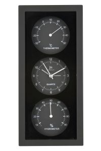 Размер корпуса: 26 x 12 x 5 см. Кварцевые часы с будильником, гигрометром и термометром в современном стиле. Могут использоваться как настенные или настольные. Матовый корпус. Электронный сигнал, бесшумный механизм с плавным ходом секундной стрелки.