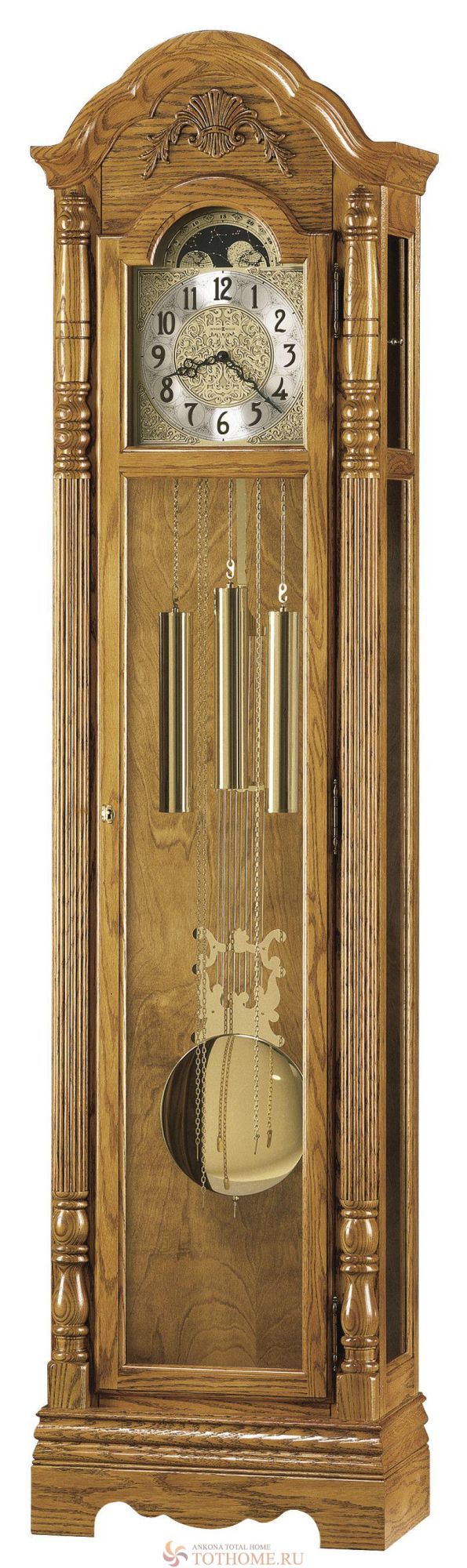 Фронтон в виде элегантной «дамской шляпки» дополняет деревянная резьба.Циферблат из полированной латуни украшен орнаментами на центральном диске и надсводных уголках.Имитация лунного календаря.Оригинальные колонны с каннелюрами украшают боковые поверхности корпуса.Остекление по всей высоте корпуса открывает вид на маятник и гири из полированной латуни.Механизм Kieninger, цепной подвес гирь, мелодия «Вестминстер», ручное отключение мелодии и боя.Корпус изготовлен из отборных пород твердого дерева и частично покрыт шпоном.Тонирование и полировка корпуса выполнены в цвете Золотого Дуба (Golden Oak).Для дополнительной безопасности дверца часов запирается на замок.