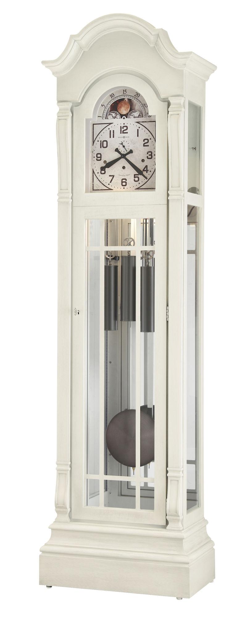 Размер: 210 x 58 x 34 см. Выпуск данной модели часов приурочен к 93-й годовщине основания компании Howard Miller. Корпус этих оригинальных напольных часов сделан из массива отборных пород дерева и шпона. Корпус отдела нв белом цвете, искусственно состарен и браширован. Модель выпущена специально к годовщине компании, о чем свидетельствует надпись "Anniversary Edition" на циферблате. Верхушка часов выполнена в виде многоуровневой "дамской шлапки", что повторяет дизайн основания часов. Зеркальная задняя стенка. Состаренный циферблат с потертыми арабскими цифрами, минутными делениями дополняет отдельный циферблат для секундной стрелки и стрелки угольного цвета. Вращающийся диск лунного календаря украшен работами художника Thomas Cole (основатель Школы реки Гудзон): "The Hunter's Return" (1845) и "Home in the Woods" (1847). Гири и диск маятника отделаны под состаренный никель. Диск маятника подвешен на деревянном стрежне, окрашенном в цвет корпуса часов. Съемные стекла верхних боковых панелей позволяют получить легкий и быстрый доступ к механизму. Циферблат и корпус часов подсвечиваются изнутри. Высокоточный немецкий механизм Kieninger, тросовый подвес гирь, мелодия «Вестминстер» играет каждые ¼, ½ и ¾ часа соответственно, бой полных часов. Автоматическое ночное отключение мелодии и боя. В поставку часов включена капсула с фамильным сертификатом, где вы можете записывать историю этих часов для будущих поколений. Регулируемые ножки часов обеспечивают устойчивость на неровных полах или полах с ковровым покрытием.