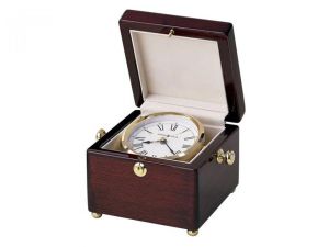 Великолепный футляр на изящных ножках из полированной латуни, кнопочный запирающий механизм, ложемент из бархата, регуляторы угла наклона часов.Шарнир позволяет повернуть часы под нужным углом к поверхности. Цифры и стрелки черного цвета.Кварцевый механизм, в поставку включена 1 батарейка типа АА.Корпус изготовлен из массива дерева.Тонирование и полировка корпуса выполнены в суперглянцевом цвете палисандрового дерева.
