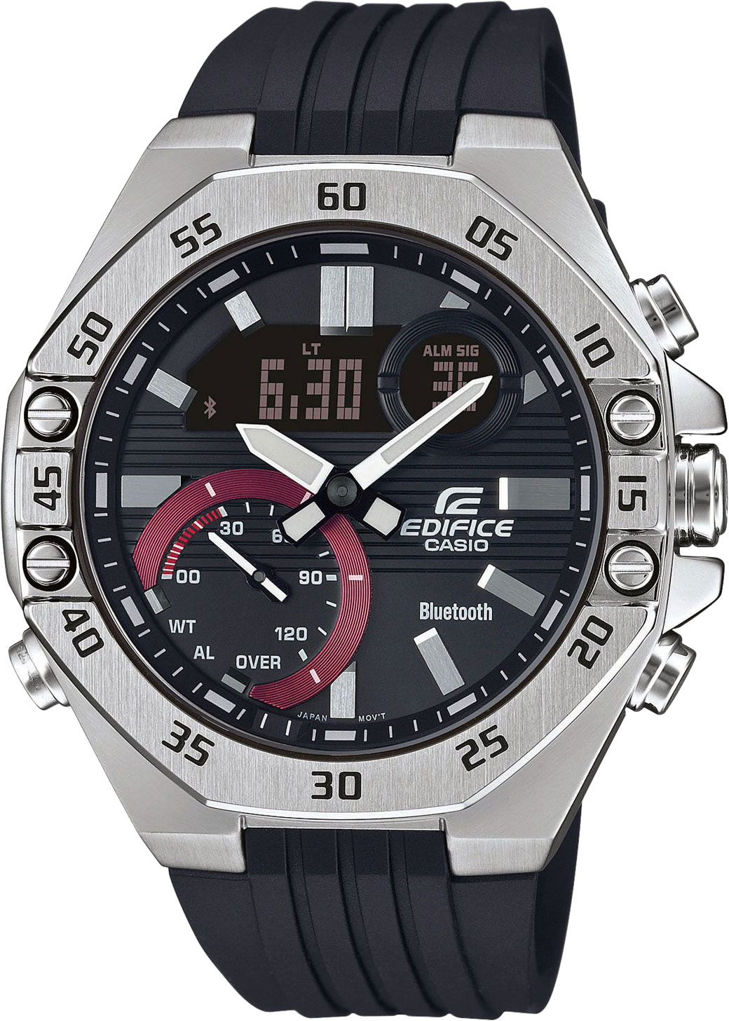 Диаметр корпуса: 48,5 мм. Новинка в серии Edifice ECB. Циферблат подсвечивается ярким светодиодом. Цвет подсветки: белый. Необритовое светонакопительное покрытие обеспечивает длительное послесвечение в темноте даже после кратковременного нахождения на свету. Мировое время – 38 городов (38 часовых поясов). Функция включения/отключения летнего времени. Секундомер с двумя точностями показаний: 1/1000с (до 1ч) и 1/10с (после 1ч) и временем измерения 24ч. SPLIT-хронограф. Таймер обратного отсчета от 1с до 24ч. Таймер расписания синхронизируется с календарем в смартфоне и производит обратный отсчет до начала назначенного в календаре события. 12-ти и 24-х часовой формат времени. Беспроводная технология Bluetooth® 4.0 со сверхнизким потреблением энергии для синхронизации со смартфоном. При подключении к смартфону часы автоматически корректируют текущее время, в том числе переход на зимнее/летнее время, копируют настройки мирового времени более чем для 300 городов, оповещают при поступлении звонка на мобильный телефон. Приложение EDIFICE Connected позволяет вести журнал показаний секундомера и прохождения этапов, вычислять разность между заданным временем и временем этапа. Отображение дней недели на разных языках. Авиарежим - часы переключаются в режим офлайн нажатием кнопки. Функции перемещения стрелок для беспрепятственного просмотра информации на цифровых дисплеях, отключения/включения звука и поиска телефона. Заводная головка с защитой. Ремешок из полимерного материала. Звуковой сигнал 5 будильников, ежечасный сигнал. Календарь автоматический: число, день недели, месяц (до 2099г).