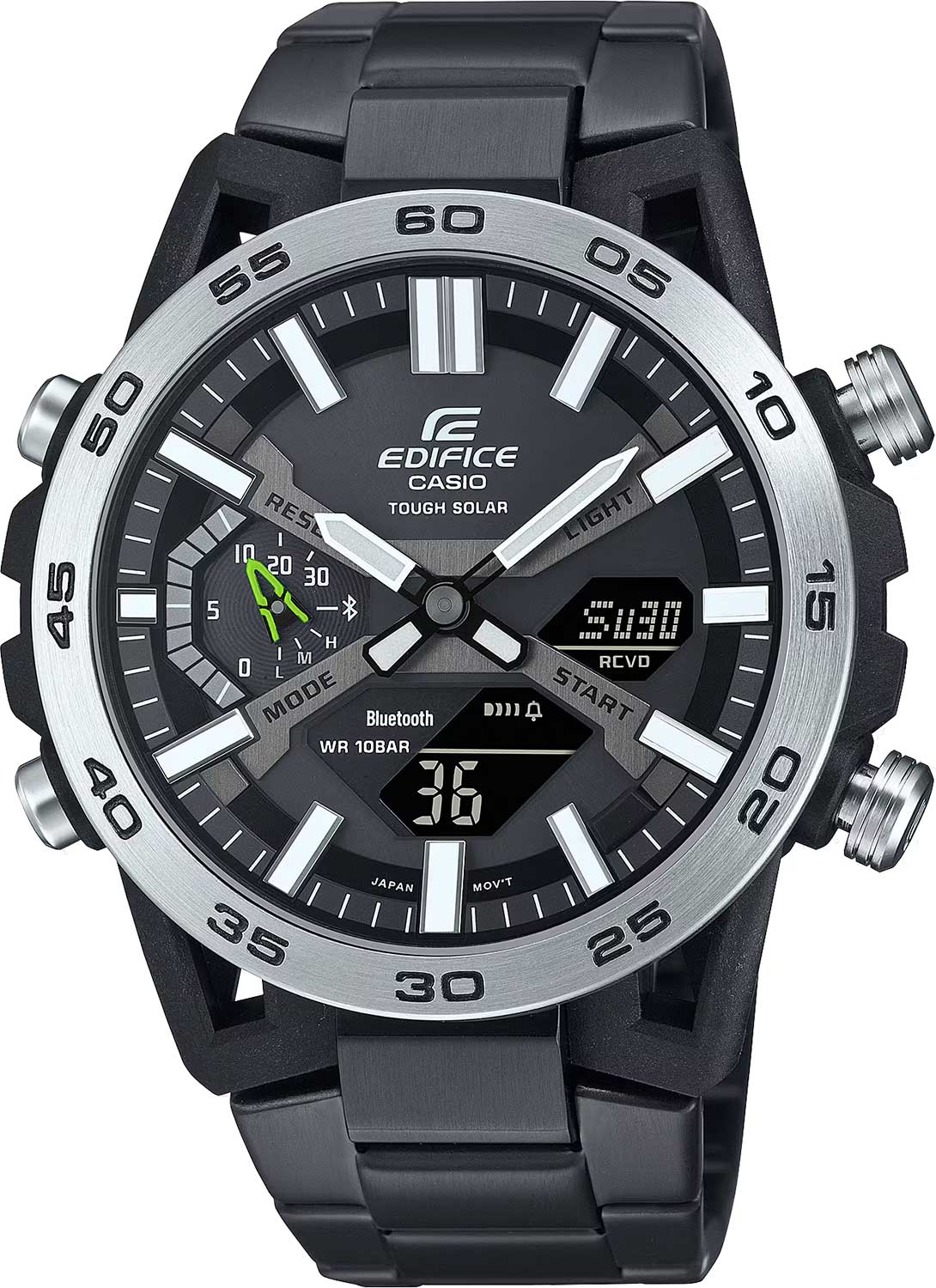 Диаметр корпуса: 47,8 мм, толщина 10,8 мм. Мужские часы, дизайн которых вдохновлен подвеской болида Формулы-1. Ушки часов разработаны по схеме четырехрычажной подвески гоночного автомобиля. Питание от солнечной энергии Tough Solar - солнечные батарейки большой мощности, индикатор заряда батареи. Функция автоматического сохранения энергии. Время работы аккумулятора без подзарядки приблизительно 7 месяцев, при включенной функции сохранения энергии приблизительно 18 месяцев. Двойная подcветка: циферблат и ЖК-дисплеи подсвечиваются светодиодом, благодаря наличию функции задержки, после отпускания кнопки освещение горит еще несколько секунд. Настраиваемое послесвечение 1,5 или 3сек. Цвет подсветки: белый. Необритовое светонакопительное покрытие обеспечивает длительное послесвечение в темноте даже после кратковременного нахождения на свету. 12-ти и 24-х часовой формат времени. Секундомер с двумя точностями показаний: 1/100с (до 1ч) и 1с (после 1ч) и временем измерения 24ч. SPLIT-хронограф. Таймер обратного отсчета от 1с до 24ч. Мировое время – 38 городов (38 часовых поясов), всемирное координированное время (UTC). Автоматический переход на зимнее и летнее время, возможность включения/отключения данной функции. Отображение кода и названия города. Переключение между домашним и мировым временем. Беспроводная технология Bluetooth® со сверхнизким потреблением энергии для синхронизации со смартфоном. При подключении к смартфону часы корректируют текущее время, настраивают будильник, а также копируют настройки мирового времени (300 городов). Отображение дней недели на шести языках. Функции перемещения стрелок, поиска телефона и включения/отключения звука. Задняя крышка крепится на 4-х винтах. Браслет с раскладывающейся тройной застежкой, расстегиваемой одним касанием. Звуковой сигнал: 5 будильников, ежечасный сигнал. Календарь автоматический: число, день недели, месяц, год (до 2099г).