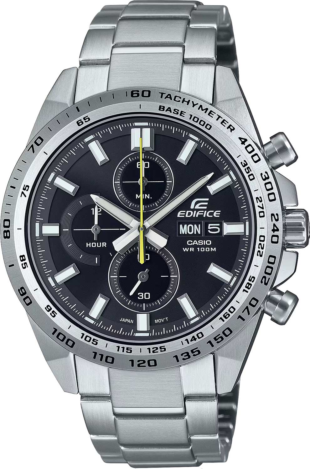 Диаметр корпуса: 42,3 мм, толщина 11,4 мм. Индикация даты и дня недели. Часы-хронограф с секундомером и тахиметром. Секундомер с точностью показаний 1с и временем измерения 12ч. Метки в виде штрихов. Заводная головка с защитой. Батарея рассчитана на 5 лет. Задняя крышка с винтовым фиксатором. Браслет с тройной раскладывающейся застежкой, расстегиваемой одним касанием.