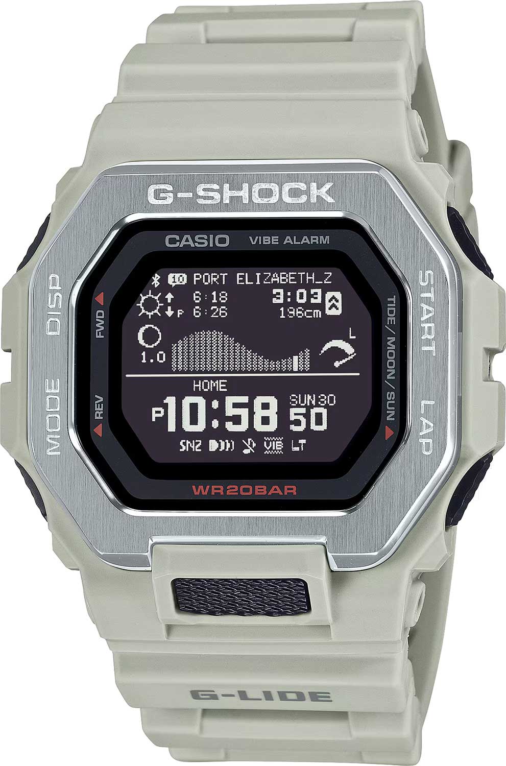 Размер корпуса: 46 х 50,9 мм, толщина 14,7 мм. Часы с функцией виброоповещения создана для серфинга и экстремальных видов спорта. Противоударный корпус защищает механизм от ударов и вибрации. Светодиодная автоматическая супер-подсветка. При движении руки дисплей освещается ярким светом. Настраиваемое послесвечение 1,5 или 3сек. Цвет подсветки: белый. Дисплей mip LCD позволяет легко считывать данные даже в темноте. Отображение возраста и фазы Луны. Графическое отображение сведений о приливах и отливах на конкретную дату и время. Время восхода и захода Солнца. Указатель дневного света.12-ти и 24-х часовой формат времени. Секундомер с точностью показаний 1с и временем измерения 100ч. SPLIT-хронограф. Возможность установить до 5 таймеров. Таймер обратного отсчета от 1сек до 1ч с автоповтором. Количество повторений таймера устанавливается от 1 до 20. Мировое время – 38 городов (38 часовых поясов), всемирное координированное время (UTC). Автоматический переход на зимнее и летнее время, возможность включения/отключения данной функции. Шагомер. Акселерометр. Функция тренировки отображает данные о расстоянии, скорости, темпе, количестве шагов, сожженных калорий (до 100 пробежек, до 140 кругов за одну пробежку). Управление данными журнала тренировок. Беспроводная технология Bluetooth® со сверхнизким потреблением энергии для синхронизации со смартфоном. При подключении к смартфону часы корректируют текущее время, дату и мировое время – 300 городов, а также включение/отключение летнего времени. Режим полета. С помощью специального приложения G-Shock Move можно легко установить информацию о приливах и отливах, а также время восхода/заката солнца примерно для 3300 точек по всему миру. Функции отключения/включения звука, виброоповещения, энергосбережения и поиска телефона. Стальной безель. Водонепроницаемость 20 Бар в соответствии с ISO 2281. Стальная задняя крышка крепится на 4-х винтах. Ремешок из полимерного материала со специальными прорезями, которые улучшают прилегание к запястью и позволяют воде или поту легко выходить наружу. Классическая застежка. Звуковой сигнал: 4 будильника, один с функцией Snooze. Календарь автоматический: число, день недели, месяц, фазы Луны (до 2099г).