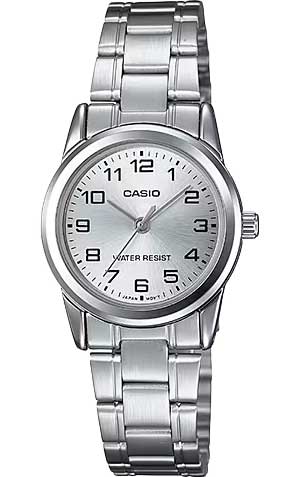 Диаметр корпуса: 25 мм, толщина 7,6 мм. Браслет с тройной раскладывающейся застежкой. Имеется мужской вариант модели MTP-V001D-7B.