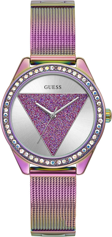 Диаметр корпуса: 37 мм. Циферблат выполнен по технологии Sunray (солнечные лучи) и частично покрыт глиттером. Круглый корпус. Безель украшен паве из кристаллов. Рифленая заводная головка. Браслет миланского плетения.