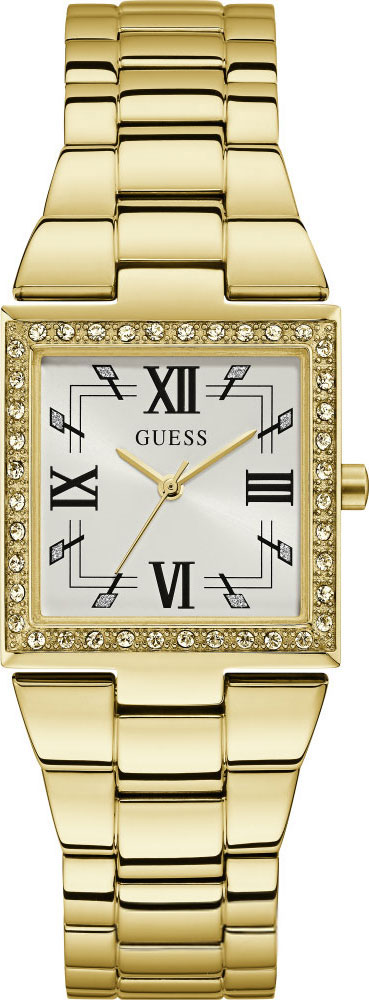 Размер корпуса: 28 х 28 мм. Циферблат выполнен по технологии Sunray (солнечные лучи). Безель украшен паве из кристаллов. Квадратный корпус. Браслет с раскладывающейся застежкой.