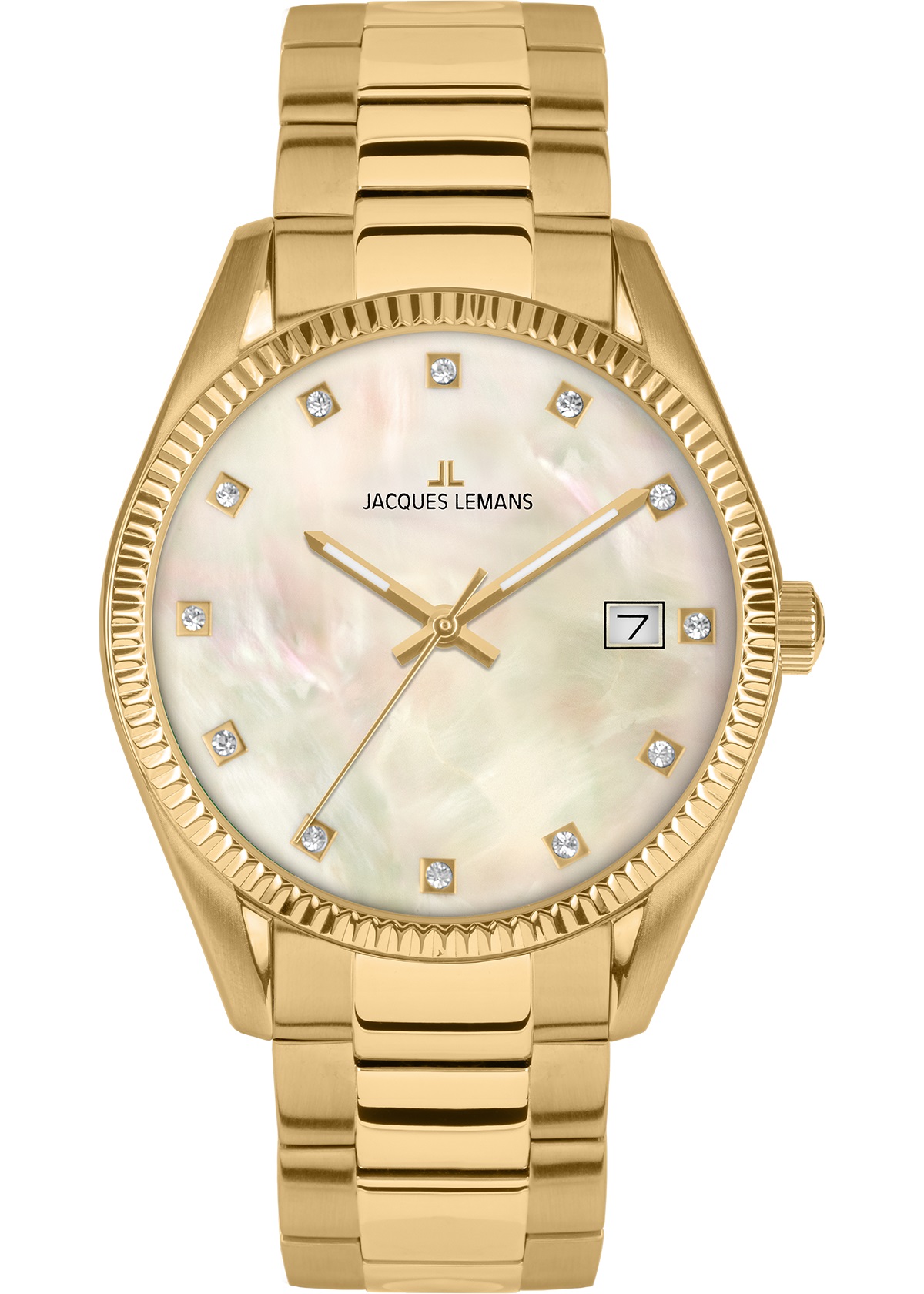 Диаметр корпуса: 34 мм. Индикация даты. Перламутровый циферблат украшен кристаллами Swarovski. Люминесцентные стрелки и метки.