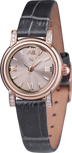 Диаметр корпуса: 24,5 мм, толщина 6,5 мм. Корпус: розовое золото 585 пробы. Кожаный ремешок, ширина 10 мм. Корпус украшен 12 фианитами. Минеральное стекло с сапфировым покрытием.