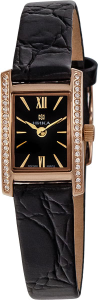 Размер корпуса: 26 х 16,6 мм, толщина 6,85 мм. Корпус красное золото 585 пробы. Кожаный ремешок, ширина 12мм. Вставка корпус украшен 36 фианитами. Стекло минеральное с сапфировым покрытием.
