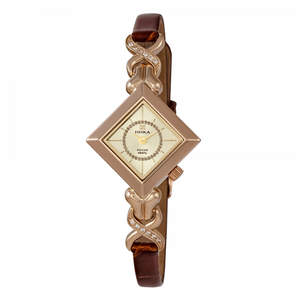 Размер корпуса: 28 х 28 мм, толщина 7,5 мм. Корпус: розовое золото 585°. Стекло минеральное с сапфировым напылением. Вставка: фианиты.