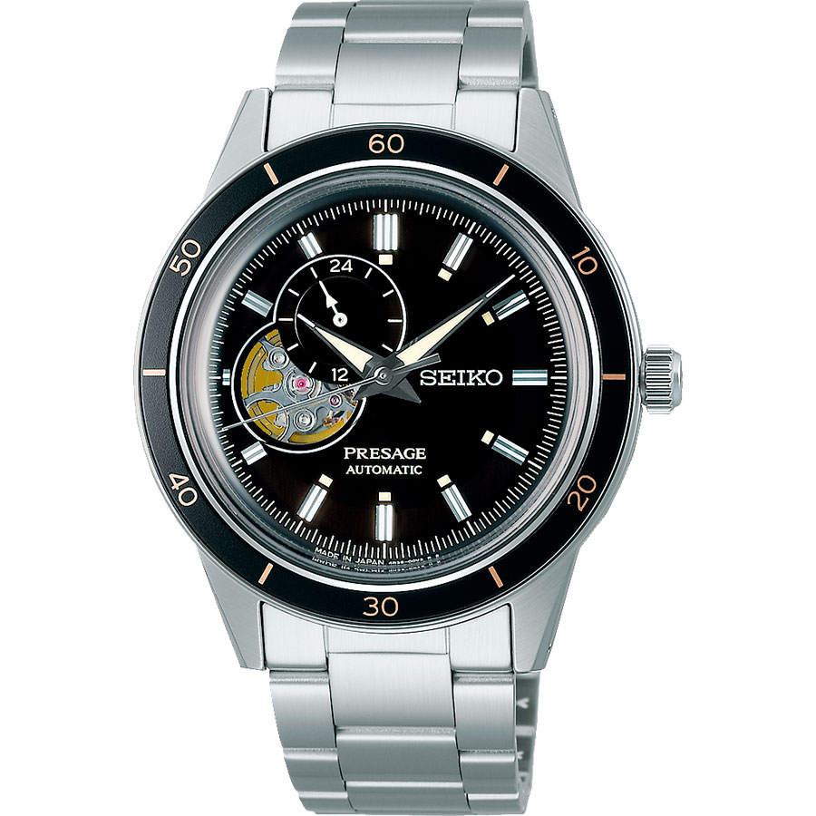 Диаметр корпуса: 41 мм. Механические часы с автоподзаводом. Серия Presage Style60's отдает дань уважения модели Crown Chronograph 1964 года. В механизме 24 камня. Запас хода 41 час. Возможность ручного завода. Функция stop-second. На безель нанесена минутная шкала с метками в виде штрихов и арабских цифр. Сквозь прозрачное окошко на циферблате можно наблюдать за работой механизма часов. 12-ти и 24-х часовой формат времени, отображаемый на отдельном циферблате. Клиновидные стрелки и метки с фирменным люминесцентным покрытием LumiBrite, которое светится в темноте после непродолжительной подзарядки на свету. Надежный стальной браслет с раскладывающейся застежкой. Циферблат, рифленая заводная головка, завинчивающаяся прозрачная задняя крышка и застежка украшены фирменными логотипами Seiko.