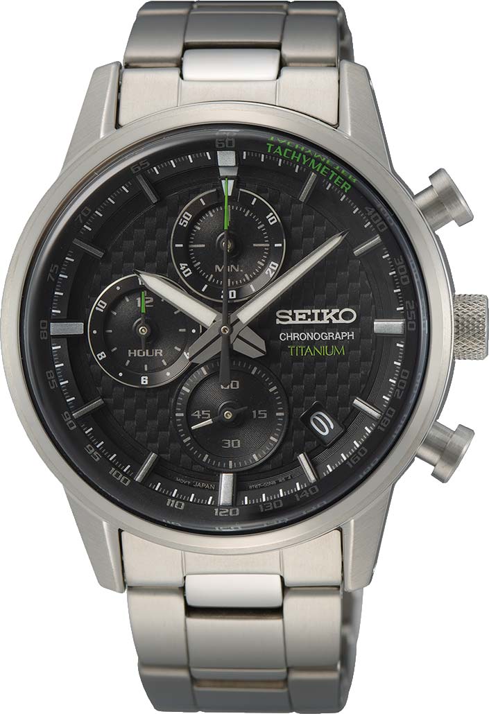 Диаметр корпуса: 41,6 мм. Часы-хронограф с секундомером и тахиметром. Секундомер до 1ч, точность 1/5с. Метки в виде штрихов. Циферблат стилизован под карбон. Окошко даты. Рифленая заводная головка. Завинчивающаяся задняя крышка. Браслет с тройной раскладывающейся застежкой.