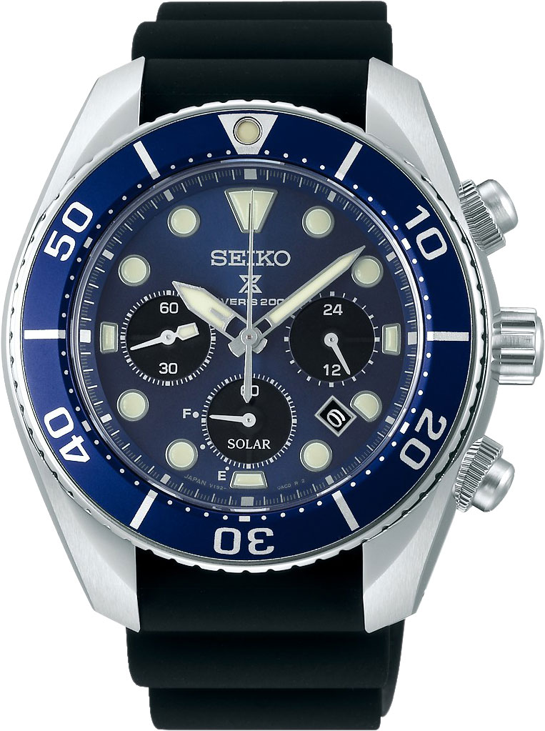 Диаметр корпуса: 44,5 мм. Часы-хронограф с секундомером. Секундомер с точностью 1/5сек и временем измерения 1ч. 12-ти и 24-х часовой формат времени. Окошко даты. Питание от солнечной энергии. Функция индикации заряда (EOL) и предотвращения перезарядки. Безель вращается в одном направлении. Завинчивающаяся задняя крышка и рифленая заводная головка. Ремешок с классической застежкой. Люминесцентные стрелки и метки.