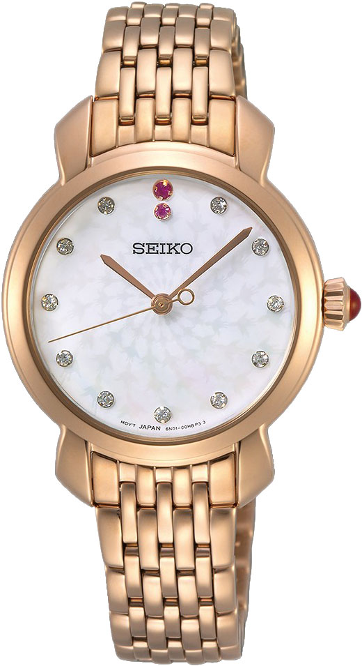 Диаметр корпуса: 29 мм. Перламутровый циферблат украшен кристаллами Swarovski. Рифленая заводная головка украшена красным камнем в форме кабошона. Браслет с тройной раскладывающейся застежкой.