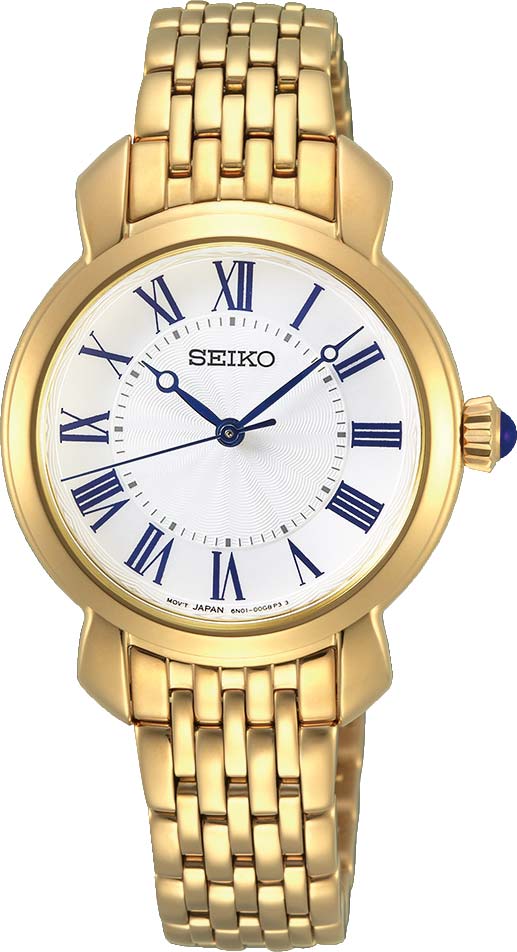 Диаметр корпуса: 29 мм. Рифленая заводная головка украшена синим камнем в форме кабошона. Браслет с тройной раскладывающейся застежкой.