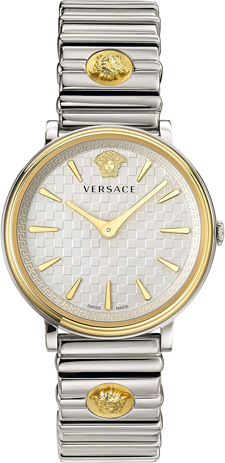 Диаметр корпуса: 38 мм. Золотистая голова Медузы на отметке 12 часов. На циферблате объемный геометрический рисунок. На задней крышке имеется фирменный знак Versace. Браслет с двумя золотистыми декоративным вставками и тройной раскладывающейся застежкой.