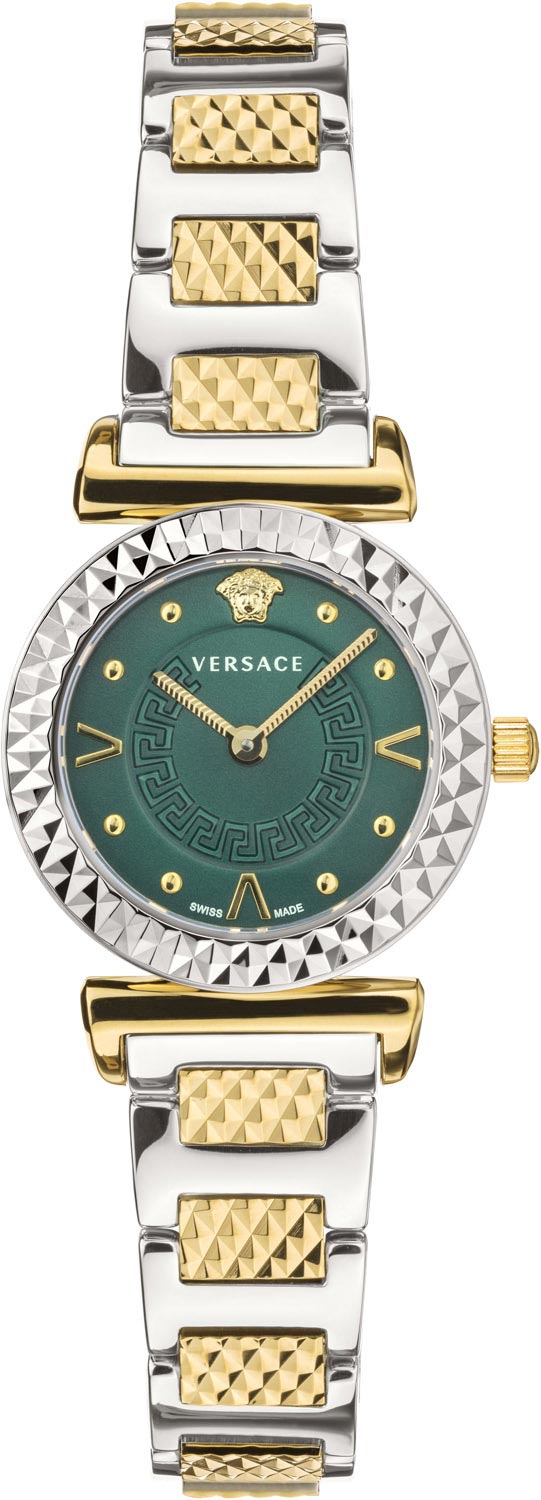Диаметр корпуса: 27 мм. Циферблат часов украшен греческим орнаментом Меандром. Золотистая голова Медузы на отметке 12 часов. Метки в виде точек и штрихов с V-образной формой, что придает этим часам индивидуальность, подчеркивая винтажный стиль. Рифленая заводная головка украшена рельефным изображением головы Медузы. Задняя крышка украшена гравировкой головой Медузы. Стальной браслет с гранеными вставками оснащен раскладывающейся застежкой.