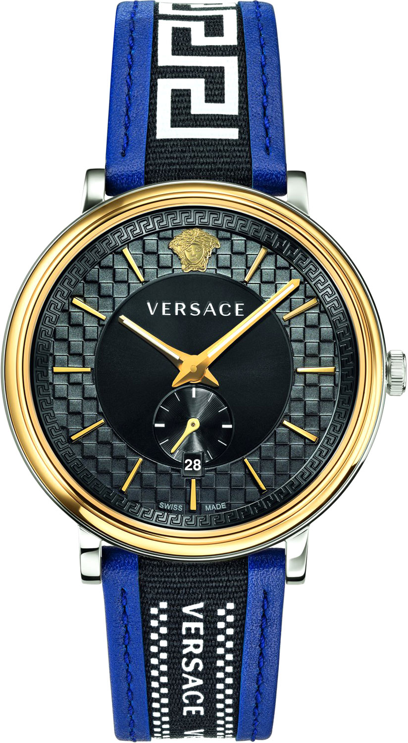 Диаметр корпуса: 42 мм. Циферблат украшен меандровым орнаментом и объемным геометрическим рисунком. Секундная стрелка вынесена на отдельный циферблат. Окошко даты. На задней крышке имеется фирменный знак Versace. Ремешок с надписью Versace, оснащен классической застежкой. Кожаный ремешок с тканевыми вставками.