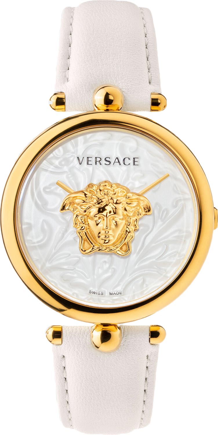 Диаметр корпуса: 39 мм. Циферблат с элементами декора Barocco. По центру расположена золотистая голова Медузы. Белый ремешок из телячьей кожи с классической застежкой. Подкладка ремня украшена принтом Barocco.