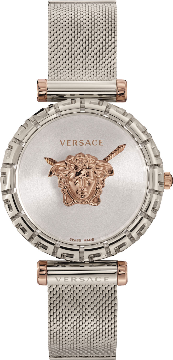 Диаметр корпуса: 37 мм. По центру циферблата расположена золотистая голова Медузы. Безель выполнен в виде объемного меандрового орнамента. Браслет миланского плетения.