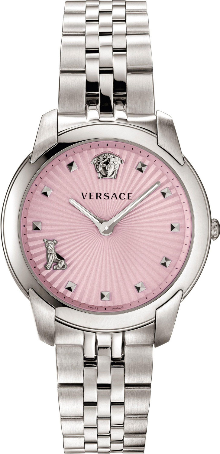 Диаметр корпуса: 38 мм. Циферблат украшен объемным лого в форме головы льва и объемным и силуэтом Одри (четвероногой спутницы Донателлы Версаче). Задняя крышка крепится на винтах. Круглый корпус. Браслет с раскладывающейся застежкой.