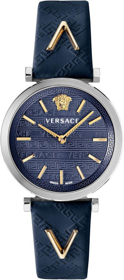 Диаметр корпуса: 36 мм. Циферблат украшен объемным лого в форме головы льва и текстурным меандровым орнаментом Greca. Метки в виде штрихов. Круглый корпус. Заводной головки нет, перевод стрелок осуществляется специальным ключиком (идет в комплекте), который вставляется в проем по центру гравированной медузы на задней стенке корпуса и нажатием позволяет установить текущее время. Задняя крышка крепится на винтах. Ремешок с тиснением и классической застежкой декорирован двумя металлическими буквами ''V''.