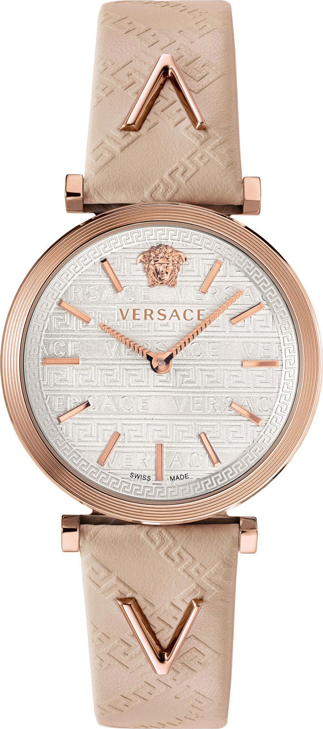 Диаметр корпуса: 36 мм. Циферблат украшен легендарной головой Медузы и текстурным меандровым орнаментом Greca. Заводной головки нет, перевод стрелок осуществляется специальным ключиком (идет в комплекте), который вставляется в проем по центру гравированной медузы на задней стенке корпуса и нажатием позволяет установить текущее время. Задняя крышка крепится на винтах. Ремешок с тиснением декорирован двумя металлическими буквами ''V'' с тройной раскладывающейся застежкой.
