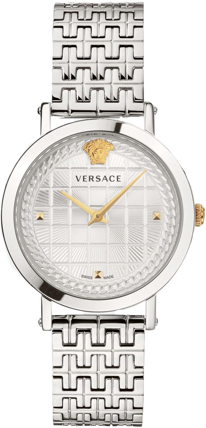 Диаметр корпуса: 37 мм. Циферблат обрамлен узором в виде цепочки. В положении 12-ти часов на циферблате - фирменный декор в виде головы Медузы. Рифленая заводная головка. Браслет с раскладывающейся застежкой.