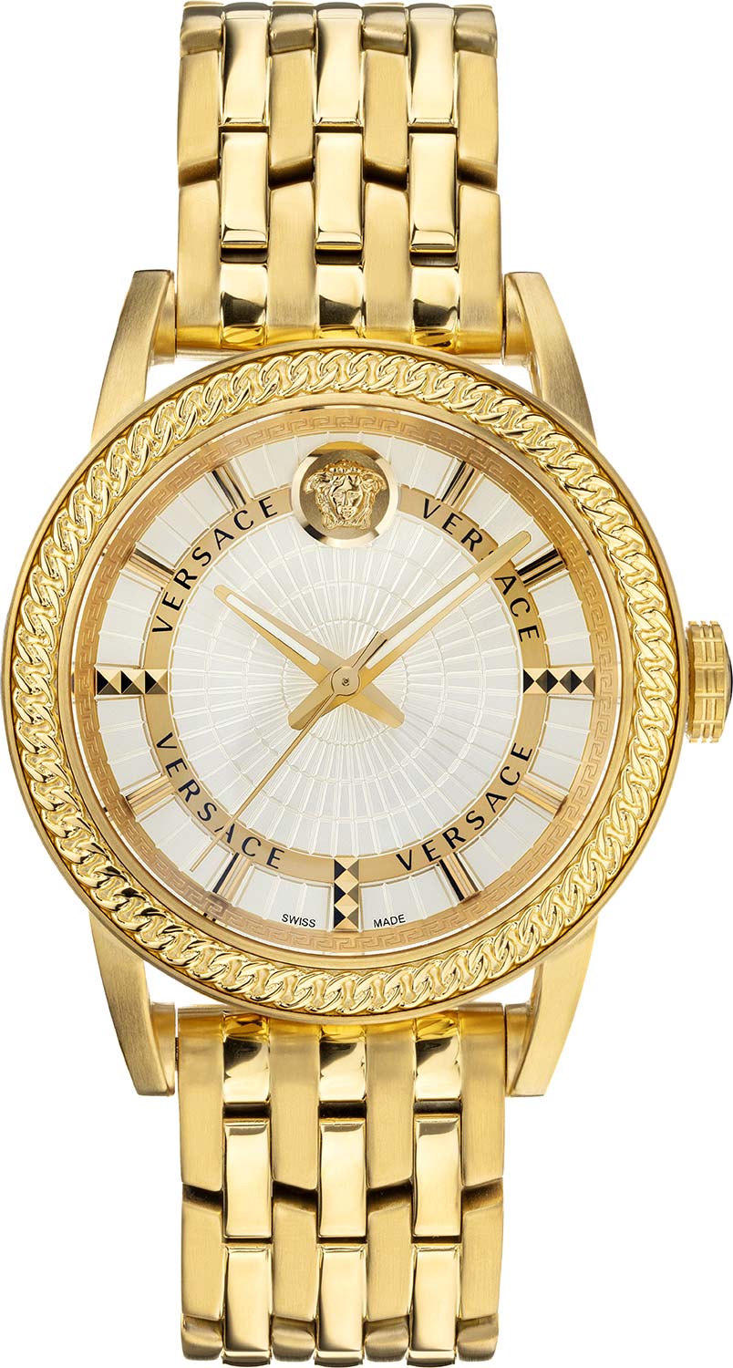 Диаметр корпуса: 41 мм. Циферблат с метками в виде штрихов. Метка на 12 часов выполнена в виде головы Медузы. Рифленая заводная головка. Браслет с раскладывающейся застежкой.
