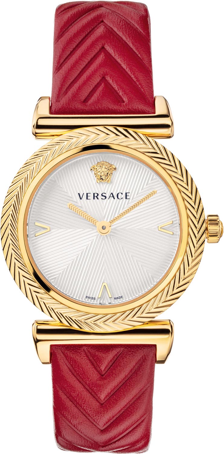 Диаметр корпуса: 35 мм. Эффектные наручные часы V-Motif Vintage. Круглый стальной корпус. Золотистая голова Медузы на отметке 12 часов. Метки в виде штрихов V-образной формы. Безель, циферблат, стрелки и ремешок выполнены с фирменным мотивом буквы ''V'', что придает этим часам индивидуальность, подчеркивая винтажный стиль. Рифленая заводная головка украшена рельефным изображением головы Медузы. Задняя крышка украшена гравировкой головой Медузы. Кожаный ремешок с раскладывающейся застежкой.