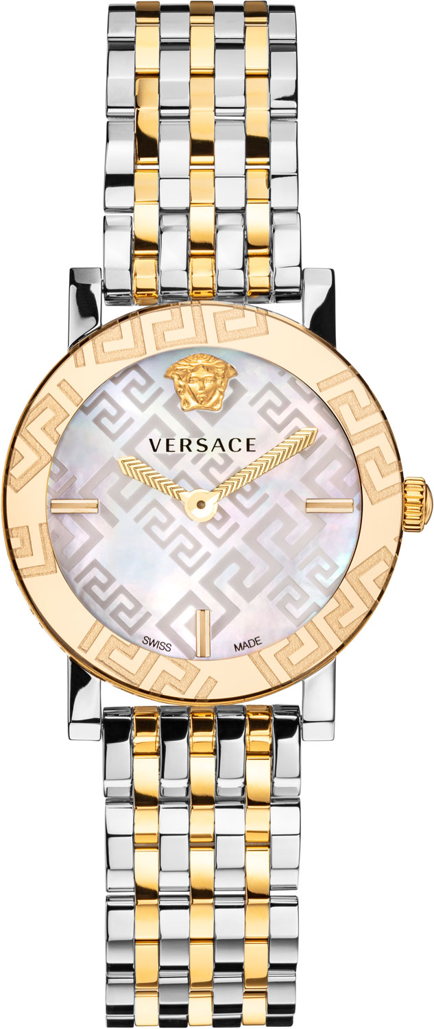 Диаметр корпуса: 32 мм. Безель украшен гравировкой, циферблат - перламутром с декоративными узорами на меандровый мотив. Мечевидные стрелки декорированы фирменным V-паттерном. Метки в виде штрихов, 12-ти часовая метка в виде головы Медузы. Рифленая заводная головка. Задняя крышка крепится на винтах и украшена выгравированным логотипом в виде головы Медузы, окруженной меандровым орнаментом Greca. Стальной браслет с раскладывающейся застежкой.