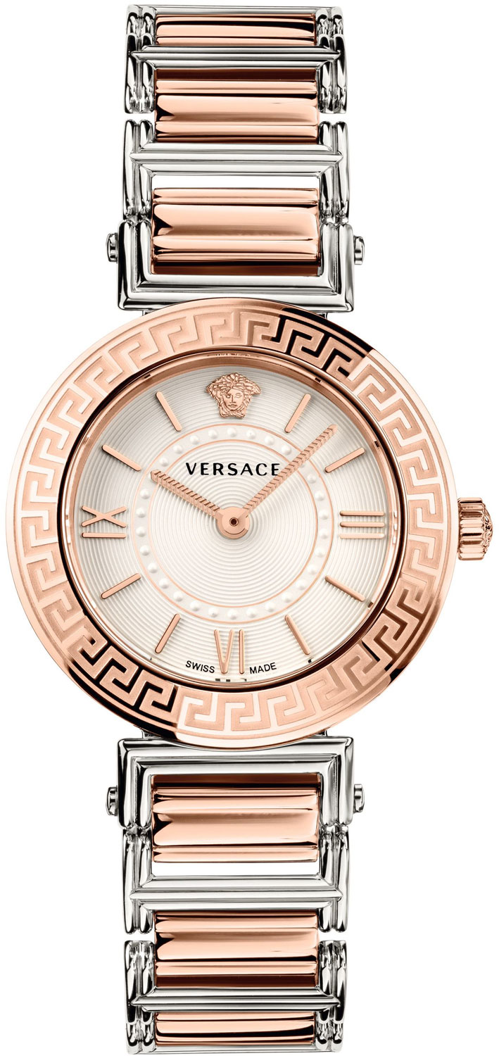 Диаметр корпуса: 35 мм. Циферблат украшен декоративным узором в виде концентрических окружностей. Заостренные прямоугольные стрелки декорированы фирменным V-паттерном. Метки в виде штрихов и римских цифр. Циферблат, рифленая заводная головка и задняя крышка украшены фирменным логотипом в виде головы Медузы. Стальной браслет с раскладывающейся застежкой.
