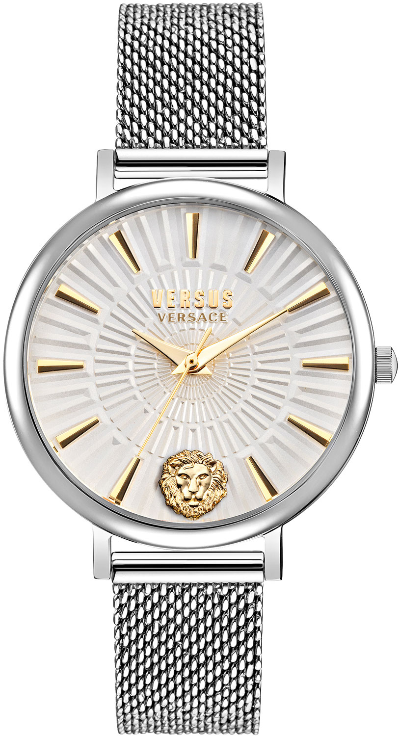 Диаметр корпуса: 34 мм. Циферблат украшен радиальным декоративным узором с V-паттерном и объемным логотипом в форме головы льва в положении 6 часов. Рифленая заводная головка.