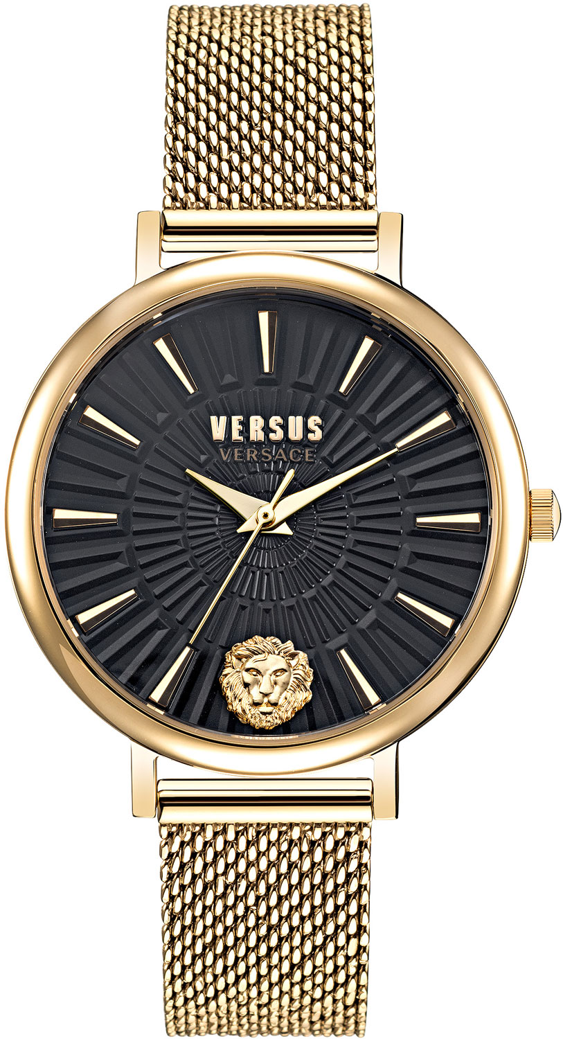 Диаметр корпуса: 34 мм. Циферблат украшен радиальным декоративным узором с V-паттерном и объемным логотипом в форме головы льва в положении 6 часов. Рифленая заводная головка.