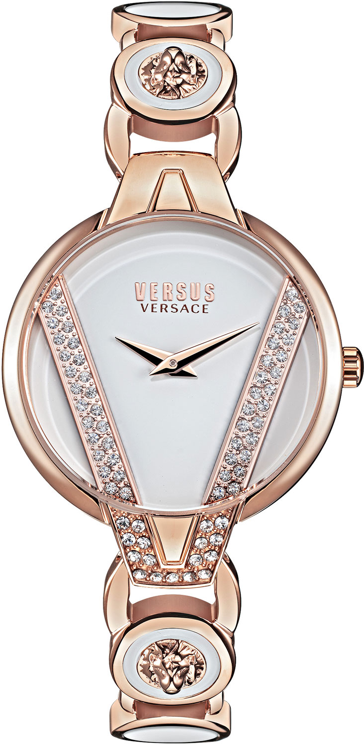 Диаметр корпуса: 32 мм. Круглый полированный корпус часов из нержавеющей стали и циферблат украшены единой фирменной буквой ''V'', усыпанной кристаллами Swarovski. Ромбовидные стрелки. Метки отсутствуют, в положении 12 часов расположен фирменный логотип. Рифленая заводная головка. Звенья стального браслета украшены вставками с объемными логотипами в форме головы льва.