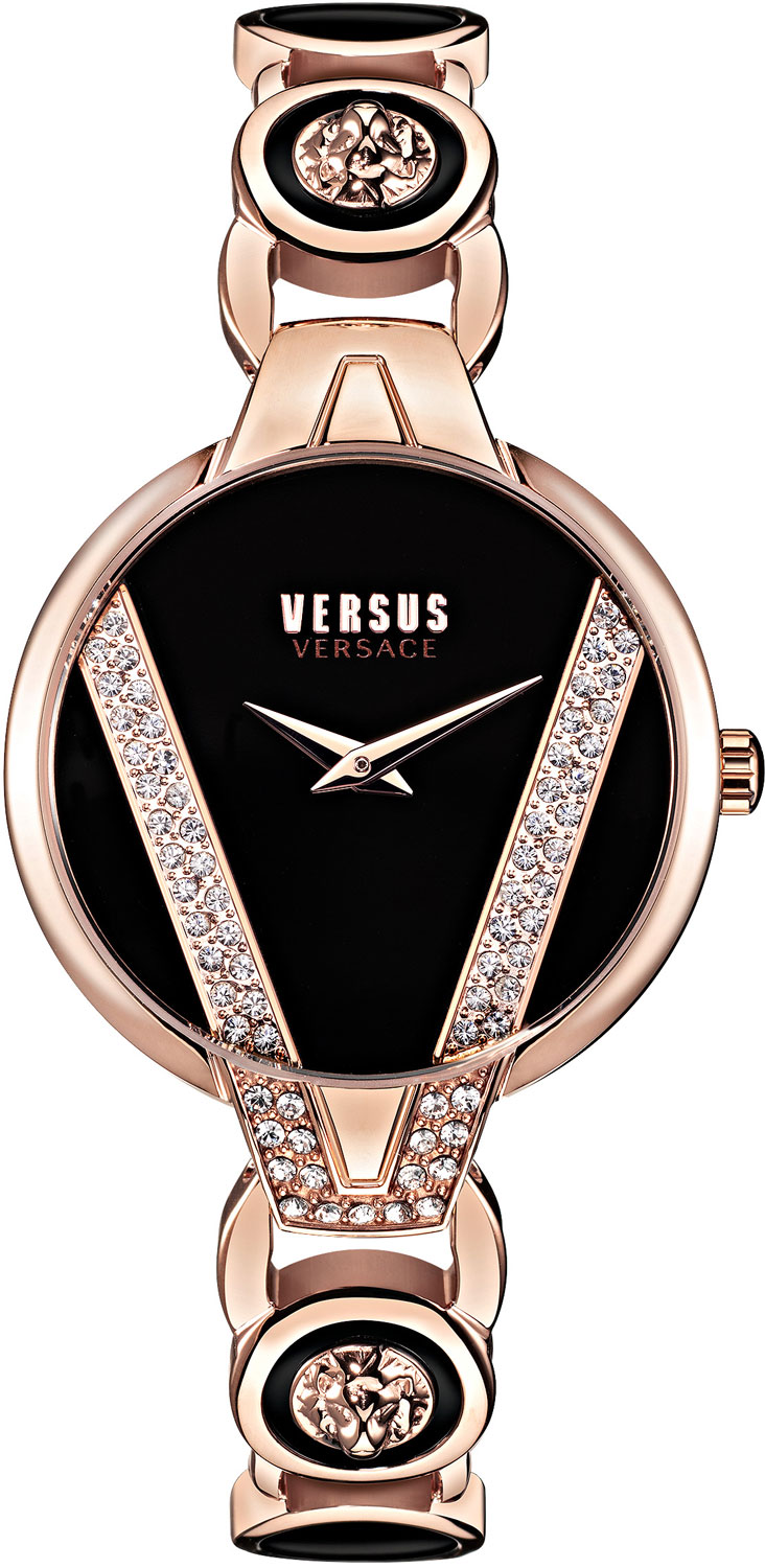 Диаметр корпуса: 32 мм. Круглый полированный корпус часов из нержавеющей стали и циферблат украшены единой фирменной буквой ''V'', усыпанной кристаллами Swarovski. Ромбовидные стрелки. Метки отсутствуют, в положении 12 часов расположен фирменный логотип. Рифленая заводная головка. Звенья стального браслета украшены вставками с объемными логотипами в форме головы льва.