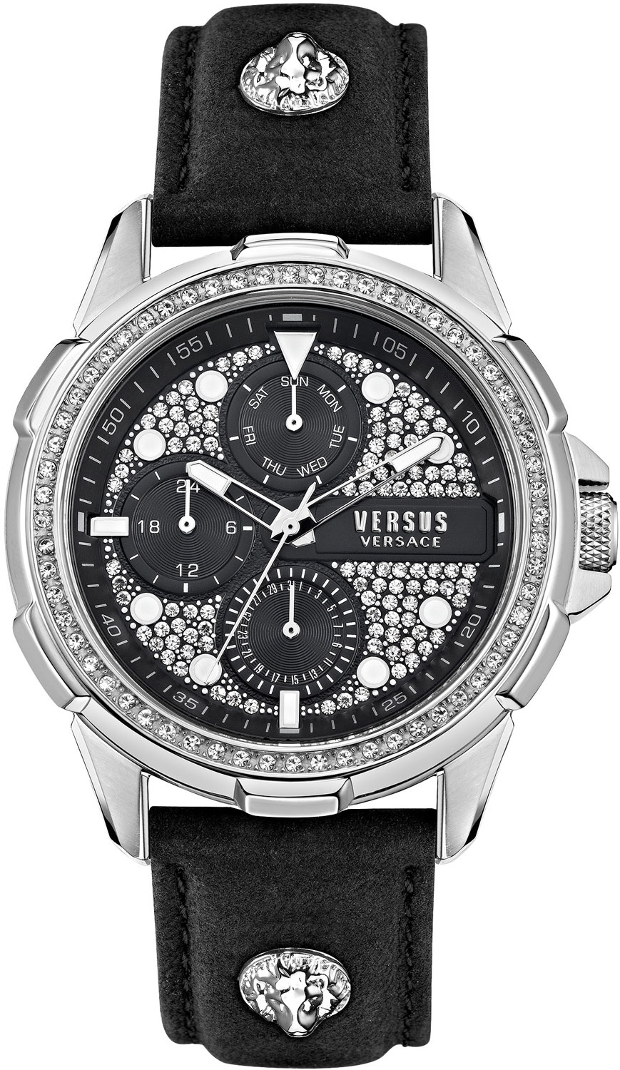 Диаметр корпуса: 46 мм. 12-ти и 24-х часовой формат времени, число и день недели отображаются на отдельных циферблатах. Безель и циферблат украшены россыпью кристаллов Swarovski. Рифленая заводная головка с защитой. Удобный ремешок из натуральной кожи украшен вставками с объемными логотипами в форме головы льва.