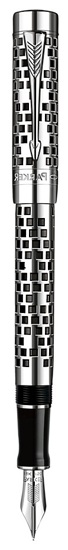 Размеры ручки: длина ручки при письме (с надетым колпачком) - 174 мм, толщина (максимальный диаметр) - 14 мм. Вес ручки: 48 гр. Материал: латунь, позолота, серебро. Вид нанесения: гравировка, гравировка с заливкой цветом, шильд, эмблема на торце ручки. Размер пищущего узла: М (medium) - Средний 1 мм. Перьевая ручка Parker Duofold Senior 125th Anniversary Limited Edition Silver это: выпуск посвящен 125 летию со дня основания Джорджем Саффордом Паркером компании "Пен Компэни Паркер" в 1888 году лимитированный выпуск, всего выпущено 1125 штук по всему миру каждая ручка имеет свой индивидуальный номер и поставляется в специальной подарочной коробке. Перо: 18 К золото (750 проба). Отделка пера: экстра-полированное, родиевое покрытие, оригинальная гравировка полностью повторяющая гравировку на перьях в 1920-годах. Отделка ручки: оригинальная глубокая гравировка серебряной обкладки барреля и колпачка из небольших прямоугольных вырезов в виде стильного геометрического орнамента через которые виден черный пластик. Особенности: завинчивающийся колпачок с широким кольцом и с глубокой гравировкой "PARKER" и логотипа фирмы