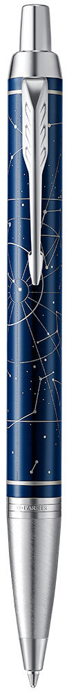 Длина: 13,6 см, диаметр 12 мм. Special Edition 2019. Стержень в комплекте синий, M (средний). Материал: нержавеющая сталь, темно-синий лак с рисунком "звездное небо". Отделка на корпусе выполнен оригинальный рисунок в виде карты созвездий ночного неба, отделка деталей - блестящий хром. Механизм нажимного действия. Используются стандартные шариковые стержни Parker.