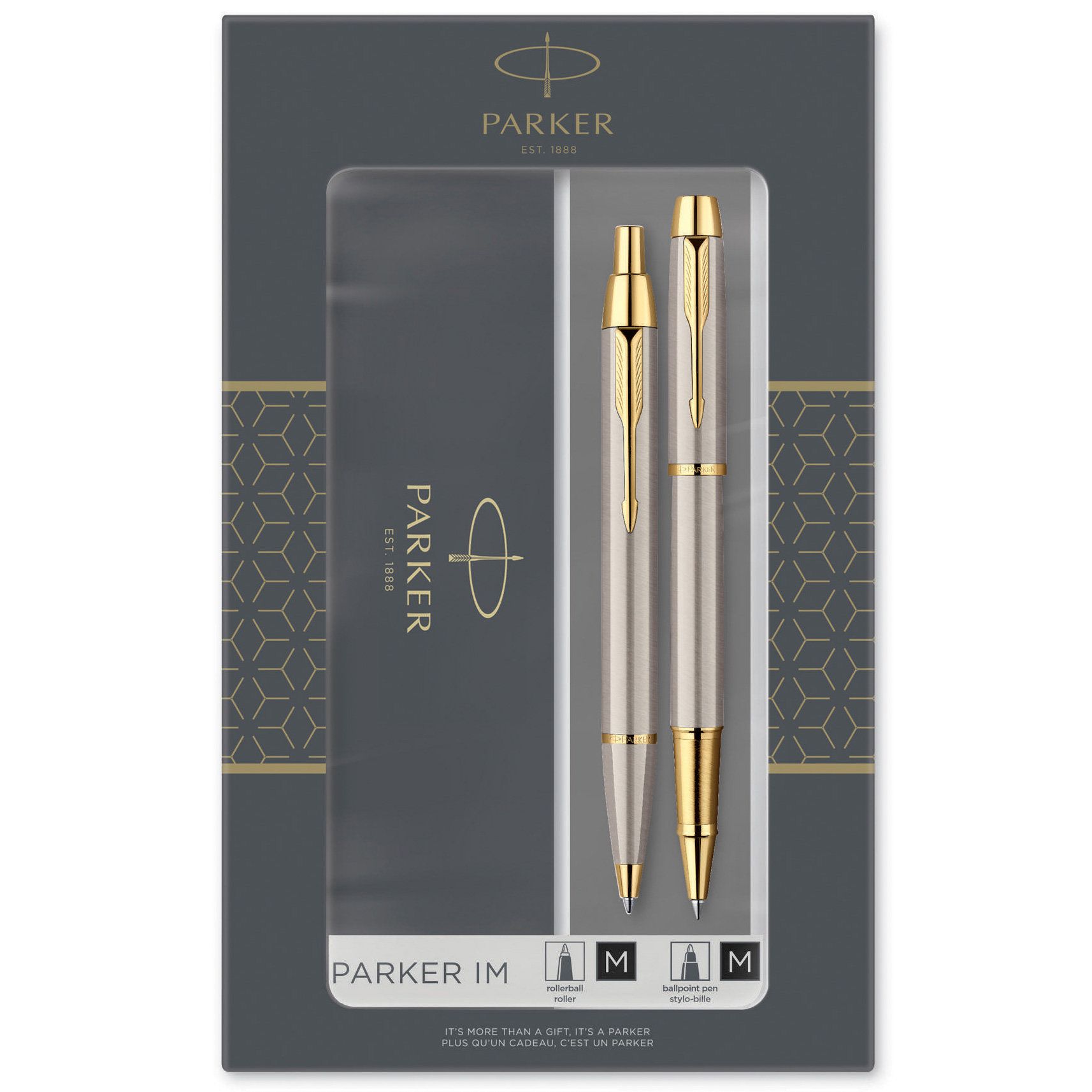 Длина: 13,8 см, диаметр 13 мм. Набор Parker IM Core 2019 года, состоящий из шариковой ручки и ручки-роллера, выполненных в едином стиле: стальной шлифованный корпус с позолоченными деталями. Стержень в комплекте черный, M (средний). Используются стандартные шариковые стержни и стержни-роллеры Parker.