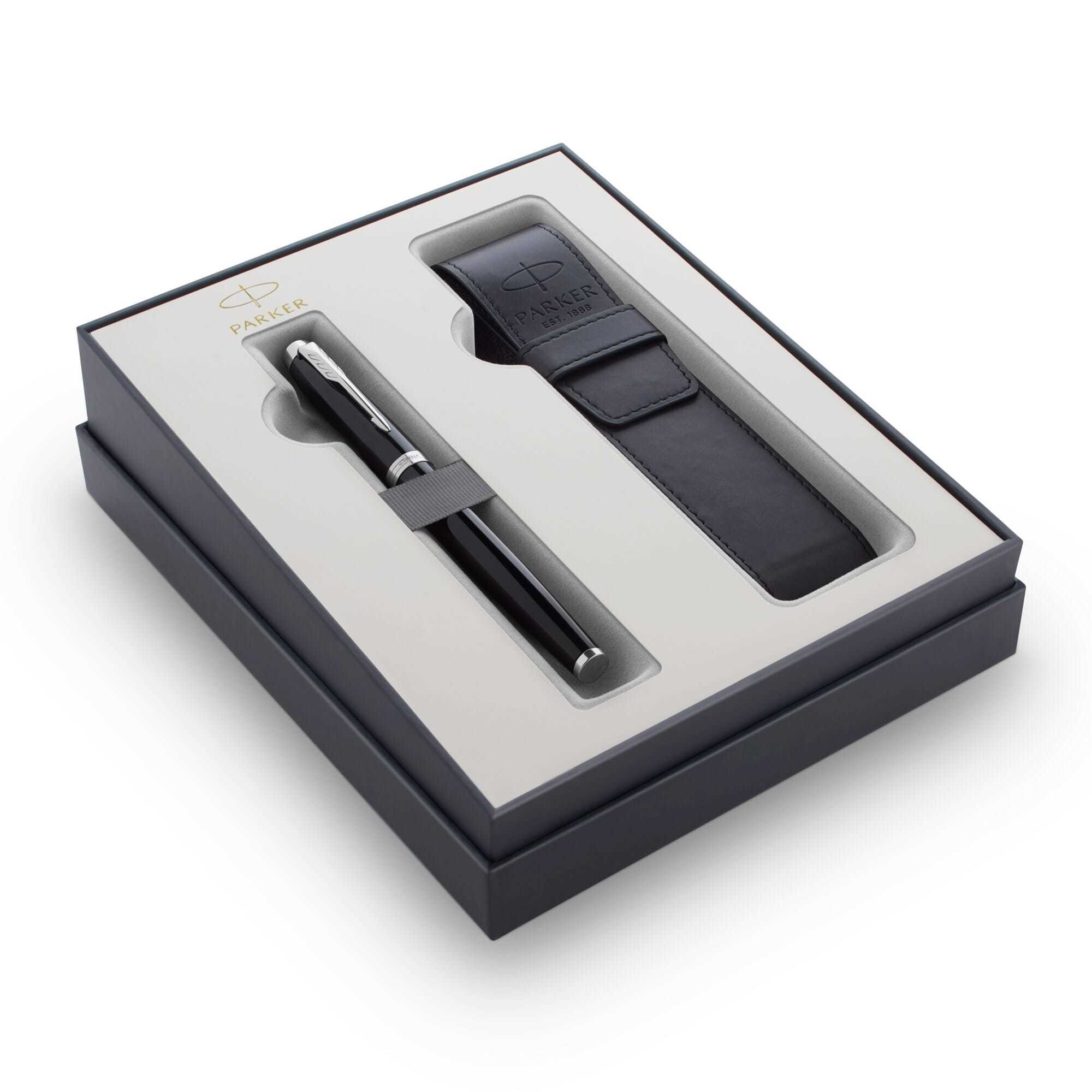 Размер чехла для ручки, мм (ДхШхВ) 160 х 35 х 17 мм. Размер фирменной упаковки набора мм (ДхШхВ) 205 х 165 х 40 мм. Перо: нержавеющая сталь. Толщина пишущего узла: средний M. Система заправки: картриджно-конвертераня. Съемный колпачок. Корпус: ювелирная латунь. Отделка: высококачественный черный лак, отдельные элементы дизайна - зеркальный хром. Цвет: лаковый черный / серебристый хром. Чехол для ручки, материал: искусственная кожа. Состав набора: перьевая ручка, синий картридж, чехол для ручки, подарочный фирменный футляр. Особенности: ручка заправляется чернильными картриджами Parker, либо чернилами из флакона при помощи конвертера, конвертер в комплект не входит.