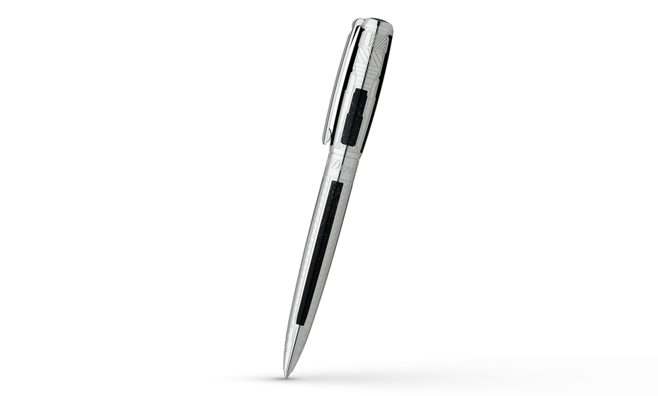 Шариковая ручка. Лимитированная серия - 888 экземпляров. Мастера компании S.T.Dupont при помощи гравировок схематически изобразили внутренние детали, обеспечивающие работу изделий. Каждый аксессуар состоит из 70 индивидуальных частей, сборка которых требует ювелирной ручной работы и исключительного контроля качества.Отделка: палладий, лак, серебряная пудра.