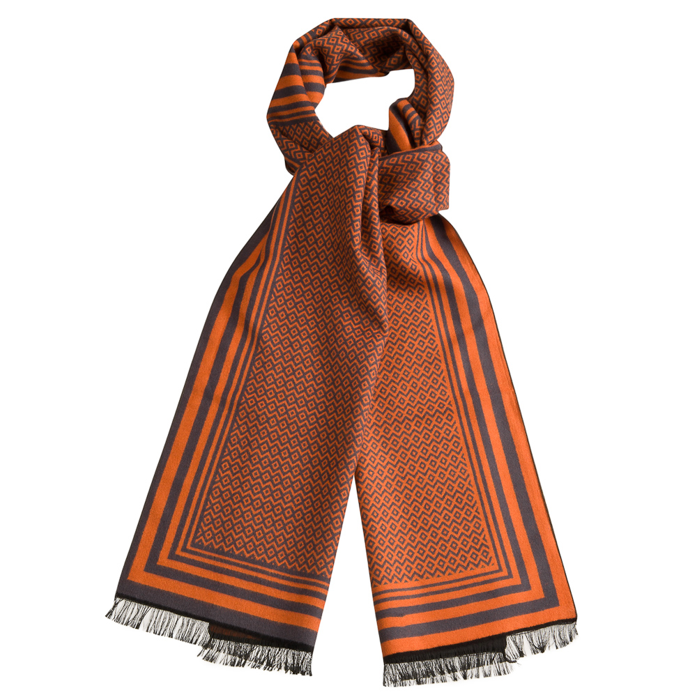 Потрясающе эффектная и потрясающе нежная модель. Комфортность безупречного состава – 80% шерсти и 20% кашемира – в буквальном смысле ощущается всей кожей. Мягкое полотно окутывает шею как волна теплого воздуха. Интересный дизайн с этнической темой и поворотными полосами, неожиданно разбивающими полотно посередине, позволяет создать необычный эффект при драпировке шарфа. Модель продается в элегантной подарочной коробке с прозрачным окошком.
