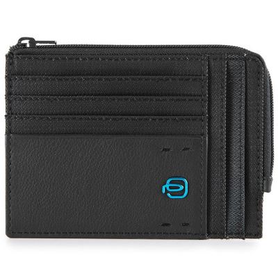 Размер: 12,5 х 9 см. Чехол для кредитных карт на молнии с отделениями для мелочи, кредитных карт и документов от компании Piquadro, коллекция P16. Натуральная телячья кожа черного цвета.