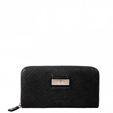 Размер: 19,5 х 10 х 2,5 см. Внутренние отделения выполнены из кожи и ткани. Портмоне имеет два основных отделения. в каждом из них находится отдел для купюр и кредитных/визитных карт. В центре – большой карман-монетница на молнии. Металлический логотип выполнен в матовой, золотой отделке.