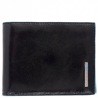 Размер: 12,5 х 9,5 х 2 см. Переднюю часть украшает вертикальная металлическая вставка с гравировкой Piquadro и голубой полосой. Внутренние отделения выполнены из кожи и украшены голубым кантом. В задней части портмоне находится два отделения для купюр, в передней – отдел для кредитных/визитных карт, внутренний карман и монетница на кнопке.