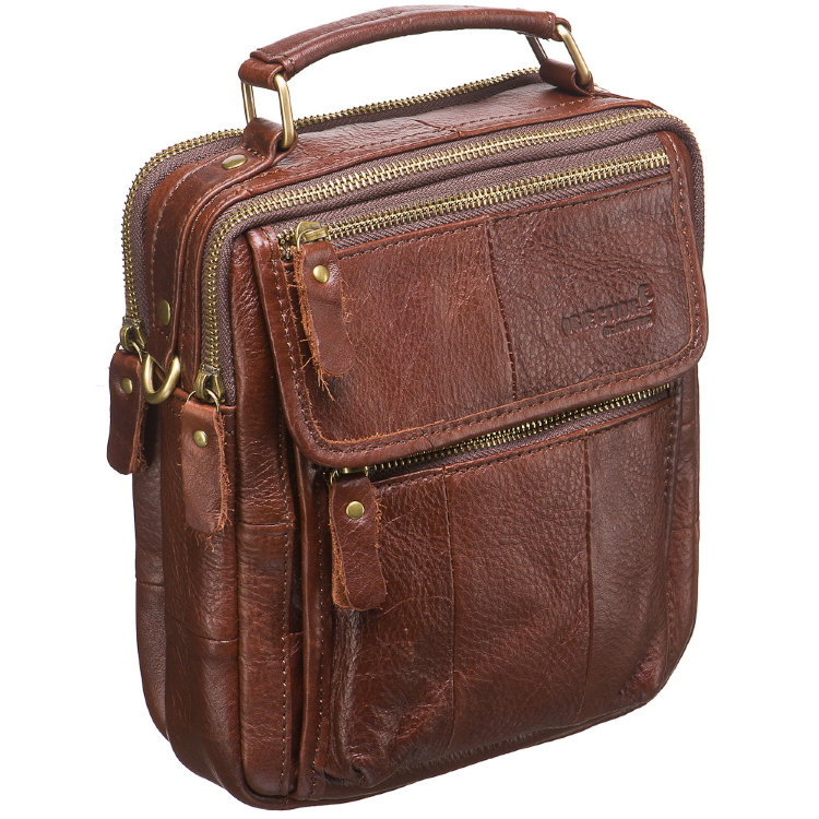 Размер: 20х22х6 см. Материал: Marlboro Brown ноская “мужская” кожа с антицарапной выделкой – легкие повреждения поверхности стираются с нее, в буквальном смысле слова, движением руки.Симпатичная сумка с двумя отделениями и множеством наружных карманов. На лицевой стороне эффектно расположились сразу три: открытый под клапаном и два на молнии. На обратной стороне четвертый наружный карман. В первом отделении сумки открытый карман и петли для ручек, во втором – потайной карман. Оба отделения закрываются на молнии. Помимо основной ручки имеется удобный плечевой ремень из прочного текстиля. Сумка сшита из особой кожи, царапины на ней, если таковое вдруг произойдет, смотрятся как заранее задуманный рисунок.