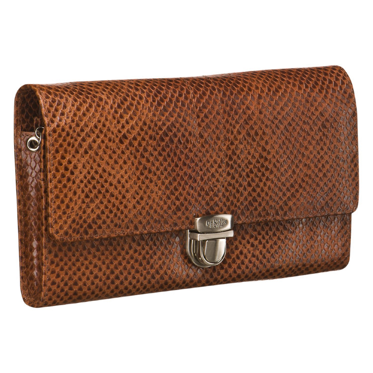 Размер: 14х24х3 см. Материал: Iguana Leather Brown.Очень достойная функциональная модель. Те, кто выбирают покупки долго и основательно, обязательно обратят на нее внимание. В этой сумке все удобно и все предусмотрено. Выдвижная ручка-ремешок легко убирается под клапан . Клапан - на скрытых магнитах. В основном отделении – набор из четырех отдельных вставок для документов, паспорта, билетов и кредиток. Есть дополнительный кармашек на молнии для купюр, металлическое кольцо для ключей на цепочке, миниатюрная авторучка. а так же гнезда для SIM карт. На задней стенке отделение на молнии.
