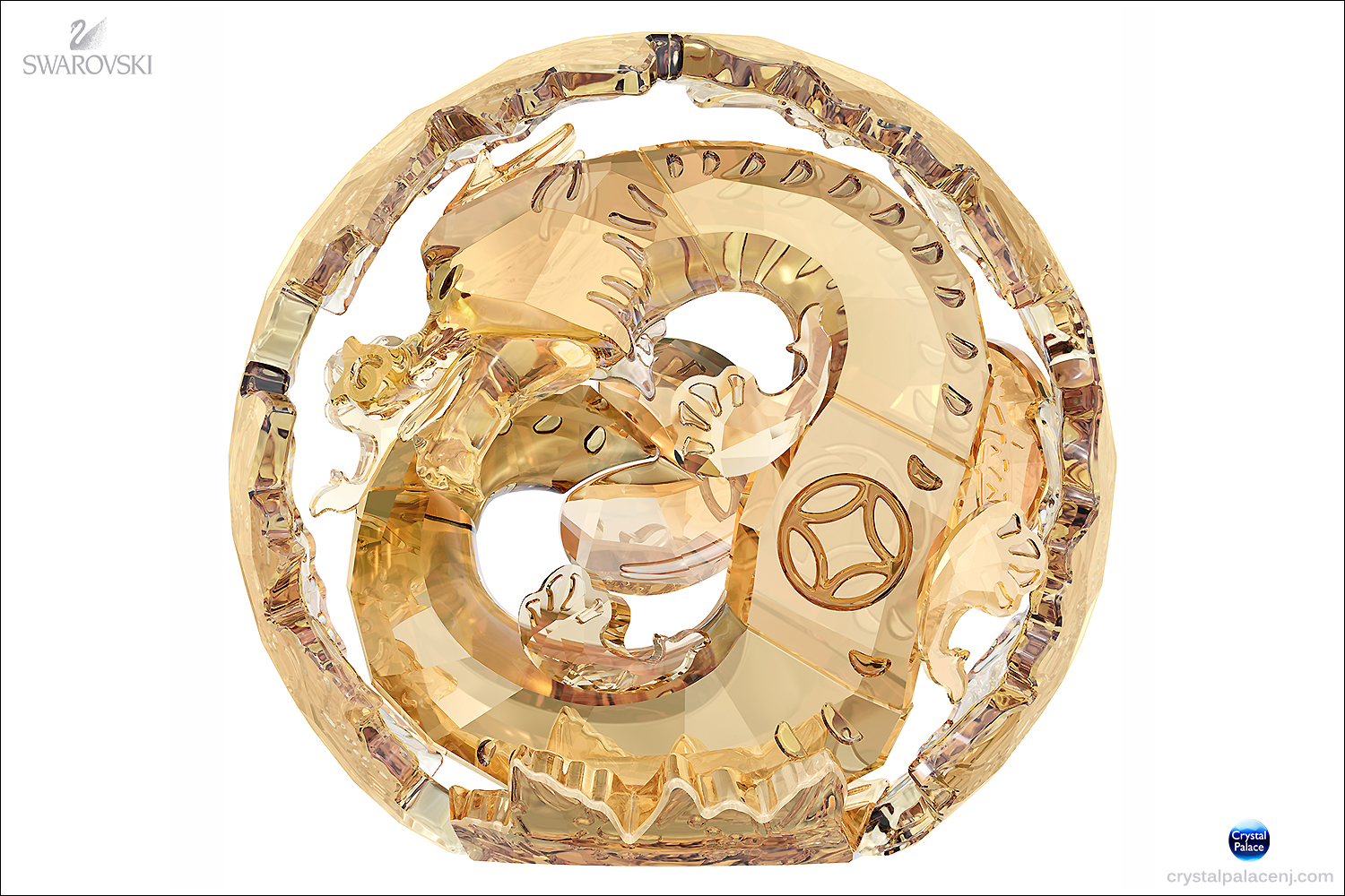 Размер: 13,6 x 14,6 x 7,9 см. Источником вдохновения для создания этого изумительного произведения послужила китайская мифология и традиционное искусство вырезания из бумаги. Сверкающий дракон из золотистых кристаллов обрамлён кольцом из нежных цветков персикового дерева. Это истинный шедевр. Этому величественному персонажу приписывают огромную силу. Это произведение станет идеальным подарком для тех, кто родился в год Дракона.